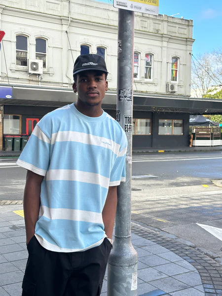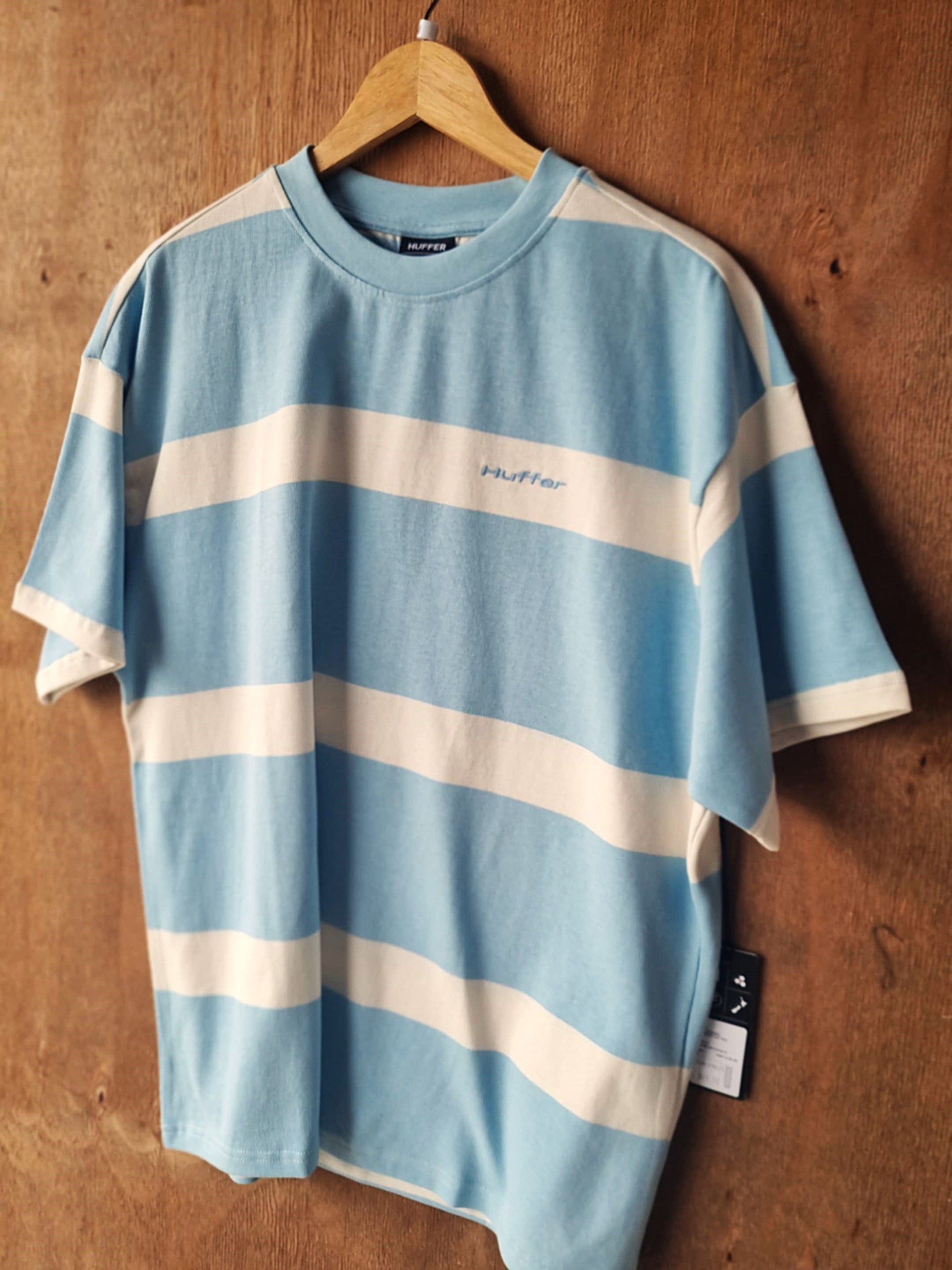 A fresh take on a classic, the Striped SS Tee features bold sky blue and white bands in a relaxed, boxy silhouette. Soft cotton and subtle embroidered Huffer branding complete the look for an easy, everyday staple with throwback charm.