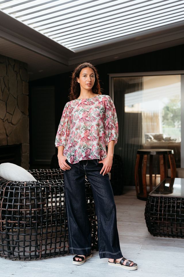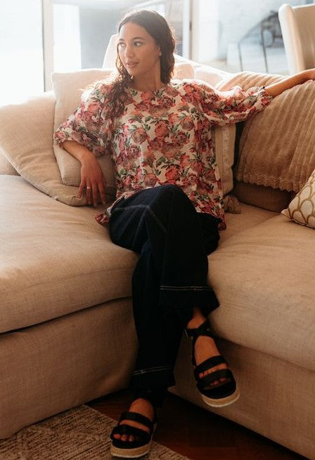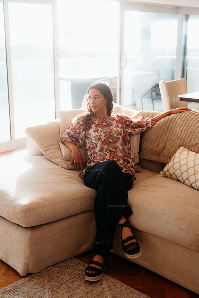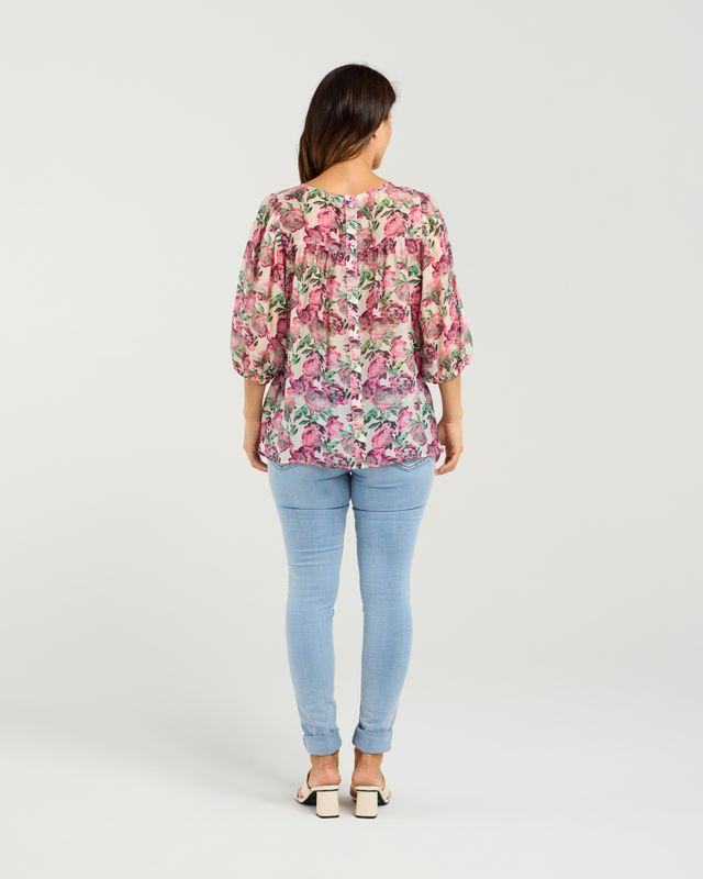 Staple Ariel Top with its three-quarter lightly voluminous sleeves, button detailing on the back, and a playful print, this garment is perfect for those summery days.