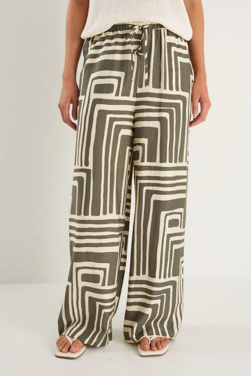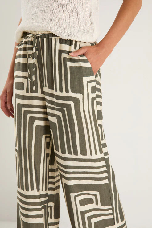 Take it easy, but make it bold. These pull-on wide-leg pants are your shortcut to standout style, with a high-rise fit and eye-catching geo print that feels effortlessly cool. Crafted in a soft viscose blend, they move with you and feel light on the skin. Perfect for all-day lounging or elevated outings.